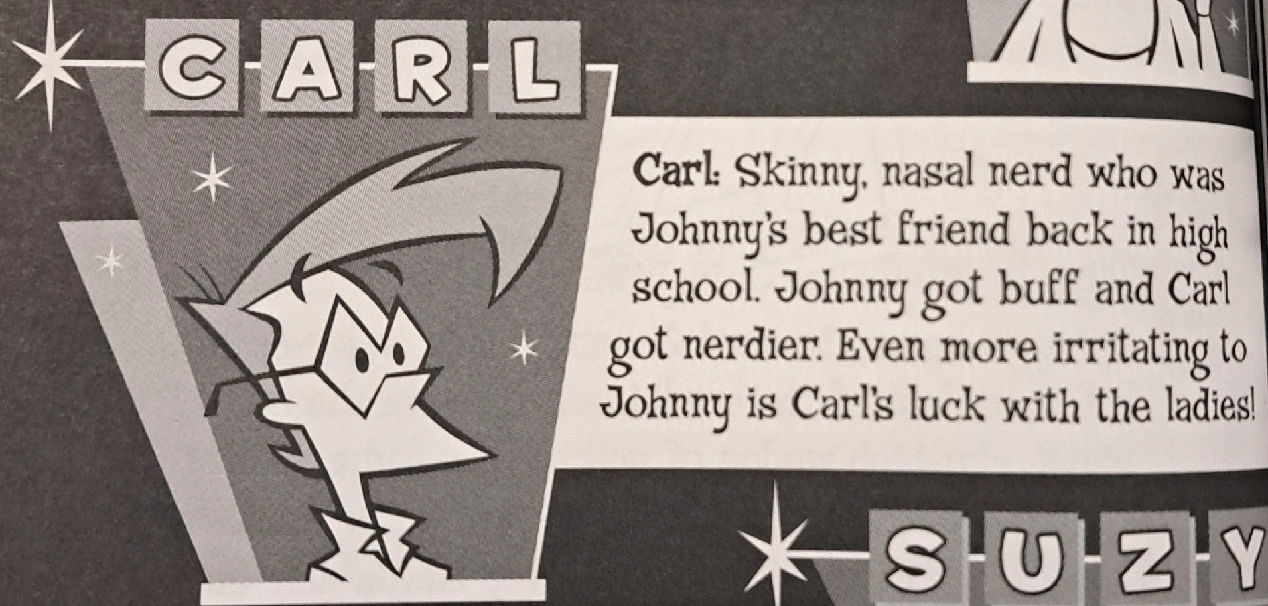 - In the Cartoon Network: Name That Toon trivia book, it's stated that Carl and Johnny were best friends in high school. As the two of them got older, Carl only got nerdier while Johnny got buff.[21] Although this goes unaddressed in the series (and must be from the series bible), it would explain at least some aspects of their relationship, particularly in how and why Carl's so attached to Johnny despite how poorly he usually treats him.