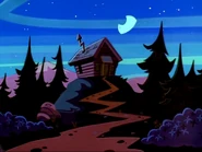 Johnny has a terrible time at camp: He becomes terrified at night, gets a rude awakening by Carl in the morning, tries to swim in the lake and gets attacked, and does not understand a word of intelligent "moon man talk" from the other campers. The group later tells scary stories around a campfire, but Johnny's story is criticized for being unrealistic.