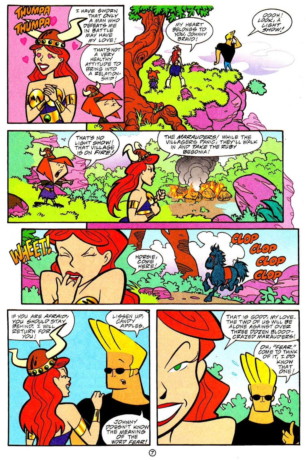 The befuddled Red Xonia was forced to admit defeat and confessed to Johnny that she had sworn her heart to him, as only a man who could beat her in battle was truly worthy of her love, meanwhile a disgruntled Suzy looked on. But before Johnny could respond, a nearby village suddenly burst into flames, and Xonia declared it the work of the Marauders. She then called her steed Horsie and dragged her new fearful mate Johnny and new sidekick Suzy with her down to the village and forced him to do battle with the bloodthirsty band of warriors by flinging Johnny around like a flail. They were victorious in the end, but before Xonia could celebrate her victory with her new mate, Johnny and Suzy slowly began to disappear. A mournful Xonia wondered if she would spend the rest of her days alone with no friends or be forced to get a sidekick.